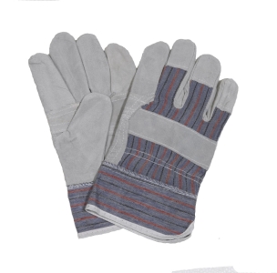 Leather Palm Fabric (Candy) Back Glove. Cow split leather palm, thumb, back, knuckle, pull & tips. Gunn cut, wing thumb half cotton lined, cotton drill candy back, shirred with a 7cm cotton safety cuff. This glove is designed for general handling operations.