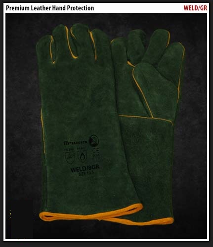 Dromex superior green lined leather welted welding gloves. Comes in either 2", 8" or 16" length Open Cuff.